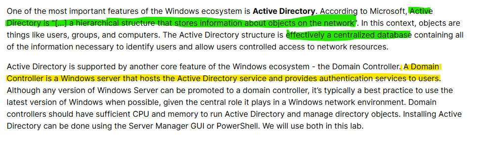 I’m a bit confused on the wordage here. It says Active Directory is “a database of network objects” which is hosted on a Domain Controller which “provides authentication services to users”.
