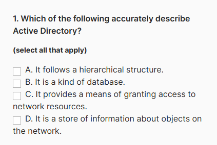 The first question is a true/false stating “Active Directory provides a means of granting access to network resources”. My gut response was false as in my head I’m basically equating AD to a file system which is just the idea of links and hierarchy and the DC is like the OS that accesses it. Like, say you wanted to have it so certain network objects were hidden to most users. The DC would be checking users first and then providing a list of what that user can see or access, right? So isn’t it entirely the DC granting access then? I guess one could say AD “provides a means of granting access to network resources” since the DC needs a list to work off of.