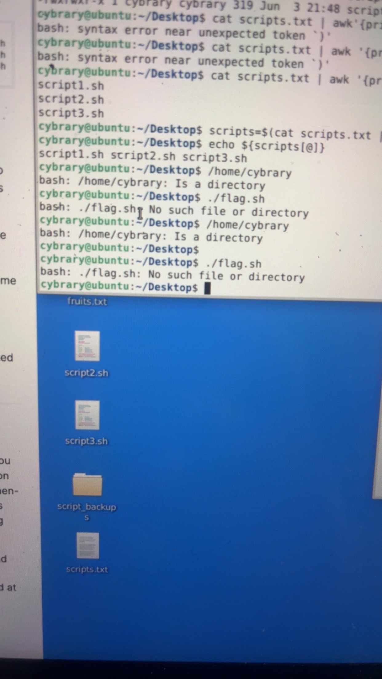 So when I do end of the lab step 26 and 27 it’s saying /home/cybraey is a directory and no such file or directory for flag