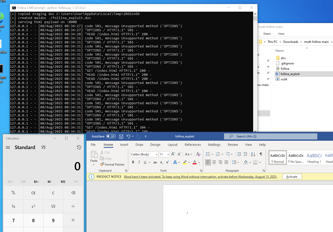 I believe this external lab is having issues. After starting the lab, there is an instruction to open the follina_exploit.doc that should begin the exploit and open a calculator. However, when opening the .doc I am just prompted to login with microsoft and no exploit runs. Is this something I should need to sign into a microsoft account for?
