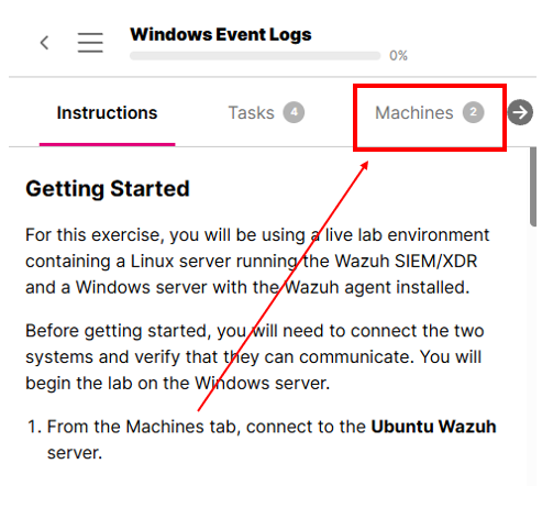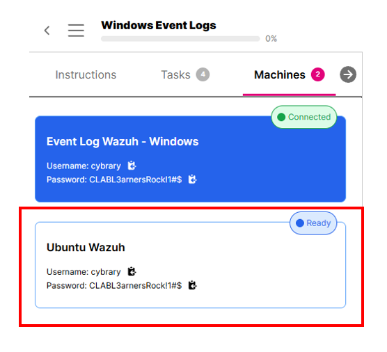 From the Machines tab, connect to the Ubuntu Wazuh server.