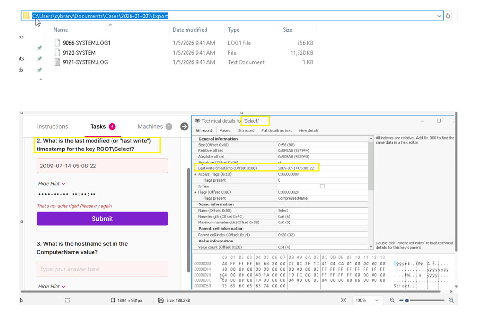 I am facing an issue while attempting Digital Forensics – Windows Registry Analysis 1.3, specifically Challenge Question 2 and Question 3.