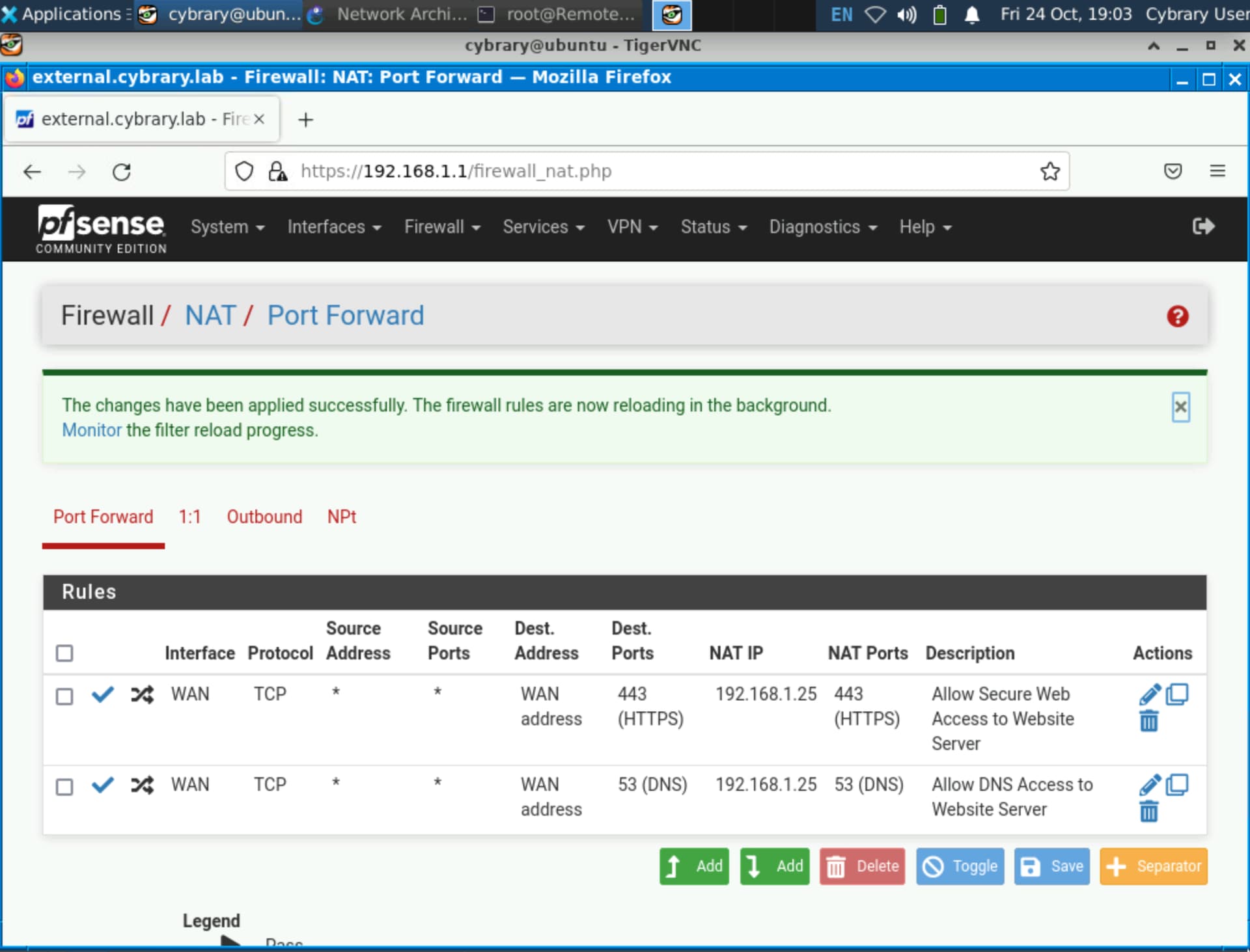 I am having issues completing the first two parts of the tasks in order to get the website flag for question 1. I set up two port forwarding rules for HTTPS and DNS to allow connection to the internal Website Server, but am still getting the same failed to resolve error.