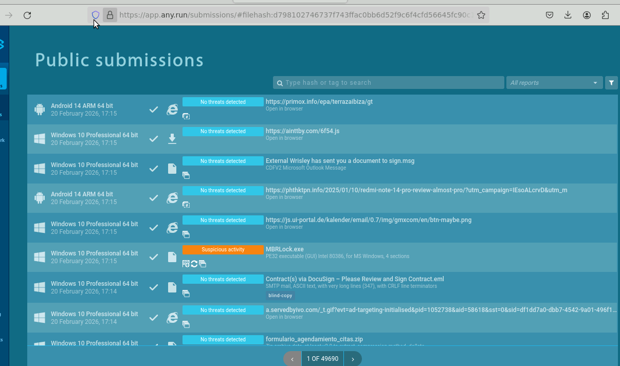When working on the Spearphishing With An Attachment Guided and Challenge labs, I am having difficulties with AnyRun. In EML, I submit the attachment hash to AnyRun but get well of 49K pages of results. It does not show one or two submissions. Even when there, if you submit the hash directly into the search or the file name, you do not get any results. In the guided exercise, I was able to ignore this section and work through it with Wazuh, but in the challenge exercise it says specifically you will find an address in AnyRun to work in Wazuh later. Need the AnyRun functionality either to work or mention a workaround to get the results you say will be returned. At any rate, I’ll work in Wazuh and see if I can backtrace and find the IP address that way.