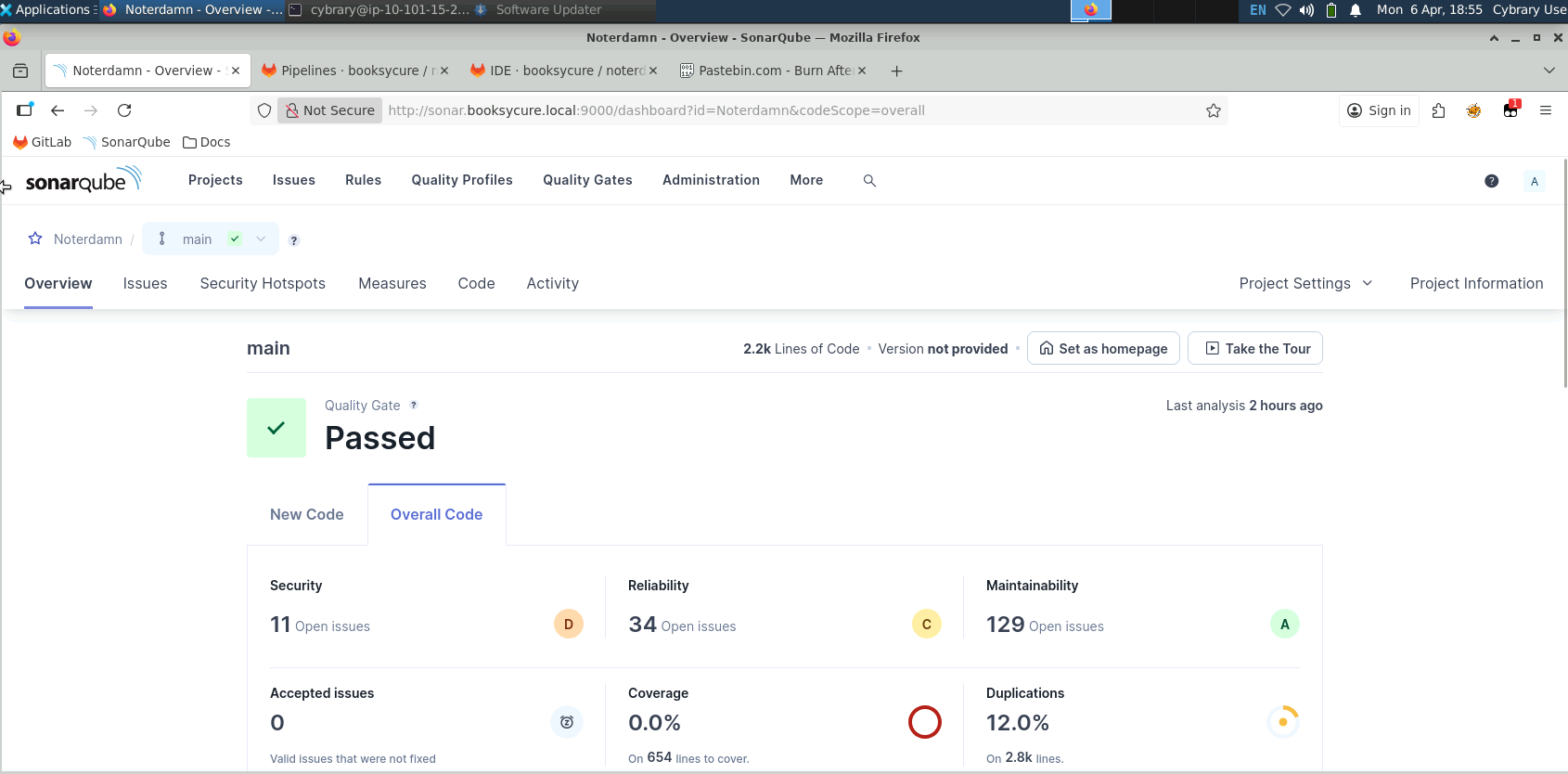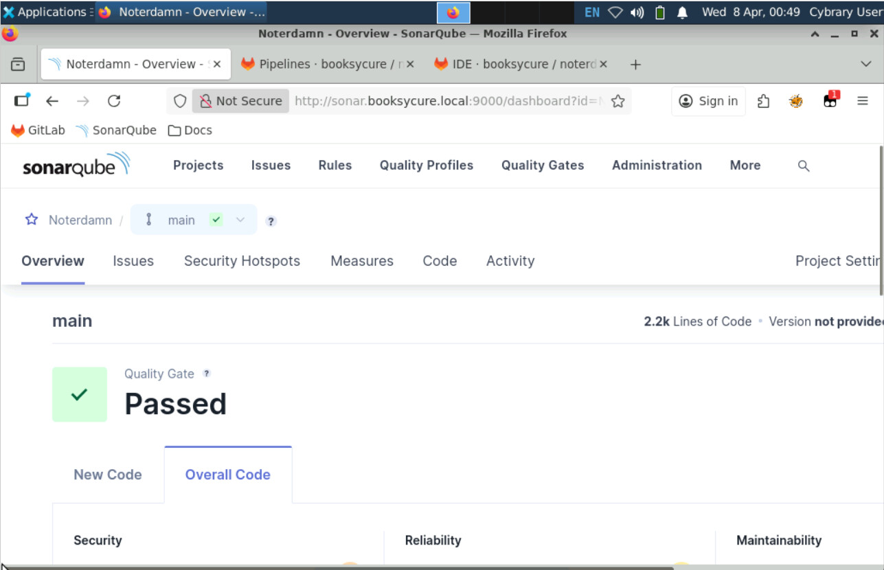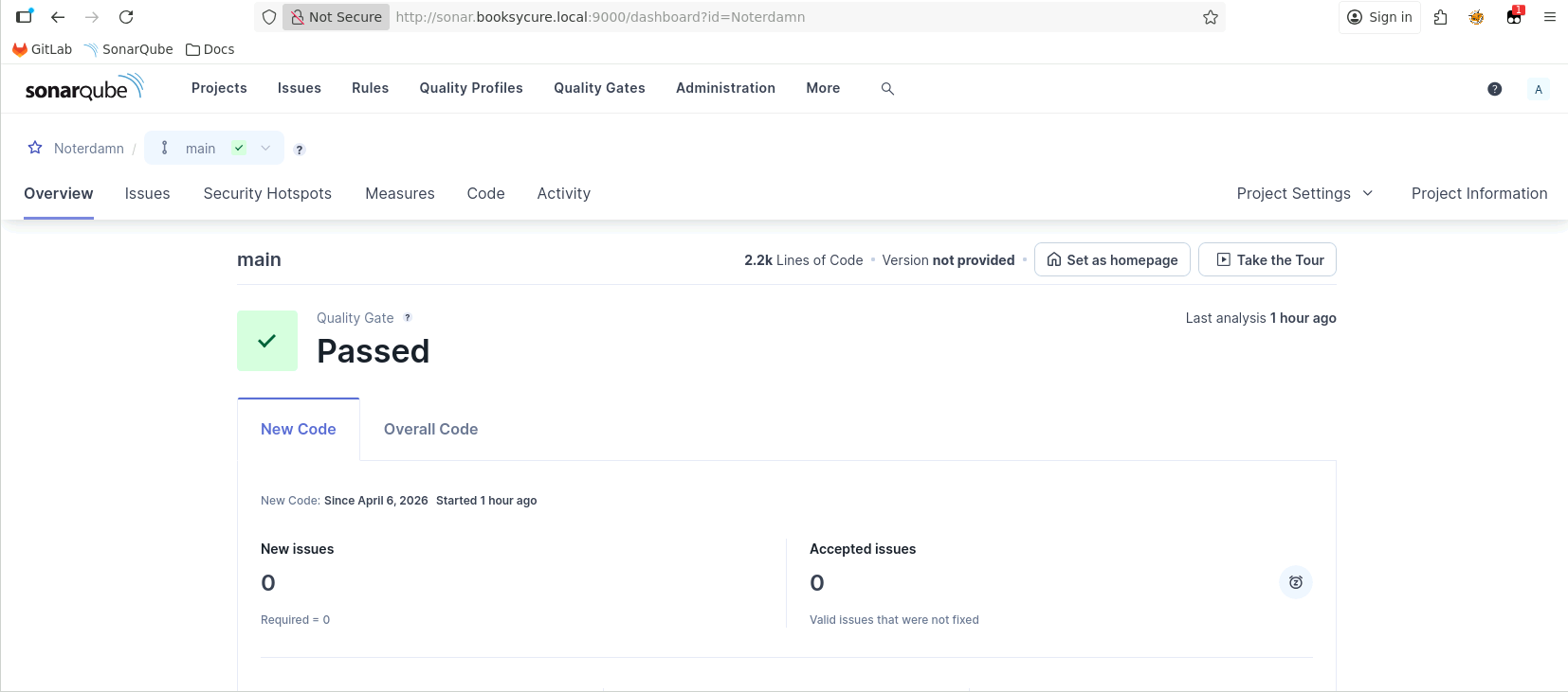 What do you see in your SonarQube Noterdamn project after running your GitLab pipeline? I want to get an idea of exactly what this failure looks like. For example, in my current session, if I navigate to the Noterdamn project in SonarQube after a successful run, I see this: