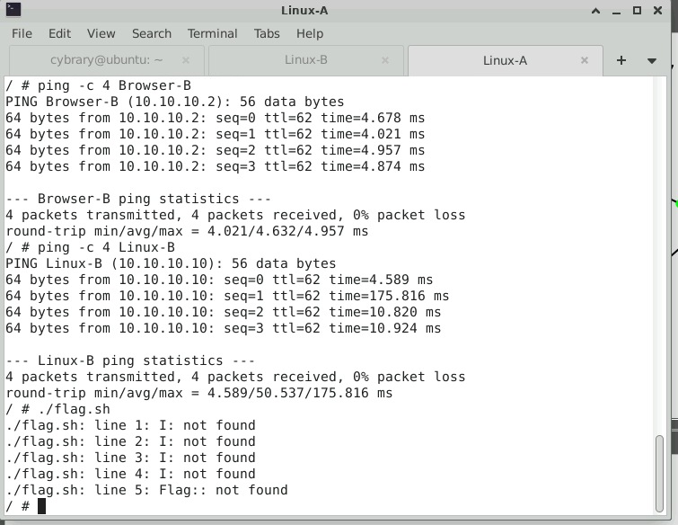 @JosephWhite This screenshot shows that I was able to ping linux b and browser b from linux a. Still unable to get flag to display properly. Appreciate the help.