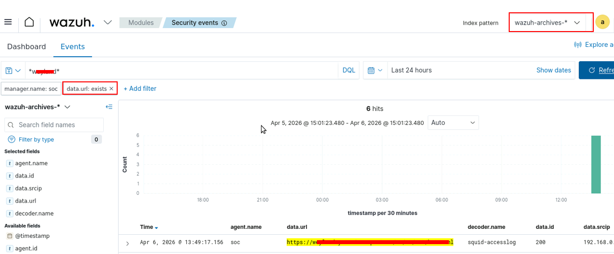 The lab is working as intended. To solve this you need to use a good keyword related to the attacker, be sure the data.url exists (to make things easier to find) and you need to look in the archives index (“Your SIEM Engineer has confirmed that the imgur URL already has an associated Rule in Wazuh, so any traffic destined for it should trigger an Alert. The remaining malicious URLs will only be discoverable in the Archives.”)